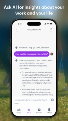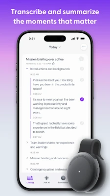 W połączeniu z dedykowanym urządzeniem Pendant, aplikacja umożliwia całodzienne, bezobsługowe nagrywanie, gwarantując niezrównaną dokładność transkrypcji. Stwórz skondensowane podsumowania rozmów, wykładów czy spotkań, oszczędzając cenny czas. Dzięki funkcji wyszukiwania opartego na AI, możesz zadawać pytania lub przeglądać transkrypcje, by błyskawicznie odnaleźć potrzebne informacje. Pendant Lifelog dostarcza również codzienne spostrzeżenia AI, podsumowujące Twój dzień, śledzące produktywność i przypominające o niedokończonych zadaniach, a także umożliwia nagrywanie offline, bez potrzeby połączenia z internetem.