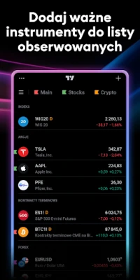 Odkryj potęgę rynków finansowych z TradingView – Twoim niezawodnym przewodnikiem po świecie inwestycji. Nasza aplikacja zapewnia bezpośredni dostęp do precyzyjnych danych od wiodących dostawców, obejmując notowania akcji, kontraktów terminowych, globalnych indeksów, Forex, Bitcoina oraz CFD. Skutecznie śledź dynamikę giełd, od NASDAQ i S&P 500 po DAX i NIKKEI 225, a także kursy walut, ceny surowców, fundusze inwestycyjne czy obligacje. TradingView to Twoje kompleksowe źródło informacji, zaprojektowane, byś zawsze był o krok przed rynkiem.